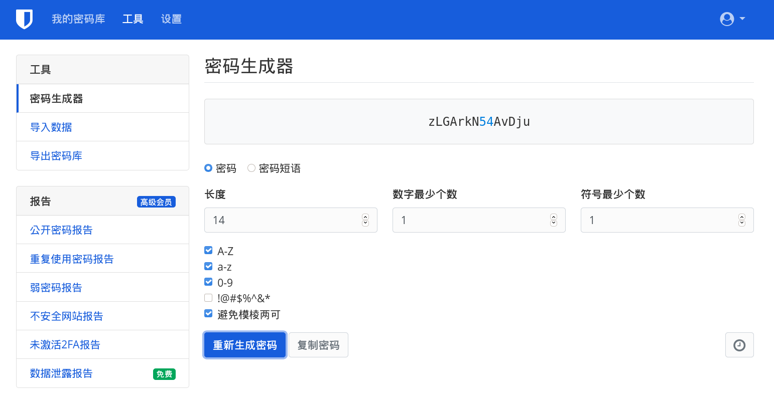 在 Bitwarden 密码库顶栏点击 工具 -> 密码生成器,你应该能看见一个专门的密码生成器: