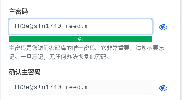 如果你有任何其它主意,你还可以把它和 noarch 的方法结合在一起!例如你还可以把最后的 Freed.m 倒序成 m.deerF, 得出最终结果 fR3e@s!n1740m.deerF. 现在你就得到了一个基本没人猜得出来,并且机器也难以爆破的主密码,用于加密你的 Bitwarden 密码库。